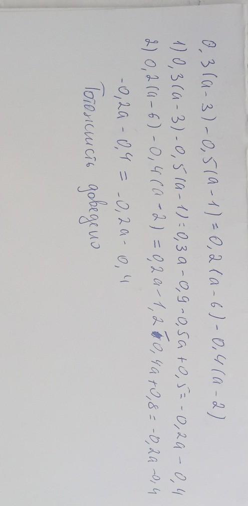 Срочно срочноооо срочно срочноооо!!!Доведіть тотожність 0,3(а - 3) - 0,5(а - 1)=0,2(а - 6) - 0,4(а - 2)