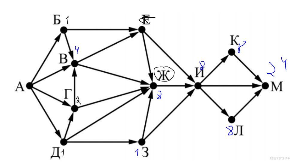 На рисунке представлена схема дорог, связывающих города А, Б, В, Г, Д, Е, Ж, З, И, К, Л, М. По каждой до¬ро¬ге можно двигаться толь¬ко в одном направлении, указанном стрелкой.Сколько существует различных путей из города А в город М, проходящих через город Ж и не проходящие через город Е?