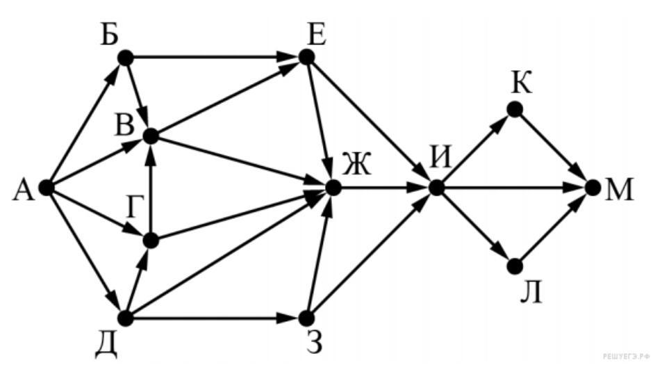 На рисунке представлена схема дорог, связывающих города А, Б, В, Г, Д, Е, Ж, З, И, К, Л, М. По каждой до¬ро¬ге можно двигаться толь¬ко в одном направлении, указанном стрелкой.Сколько существует различных путей из города А в город М, проходящих через город Ж и не проходящие через город Е?