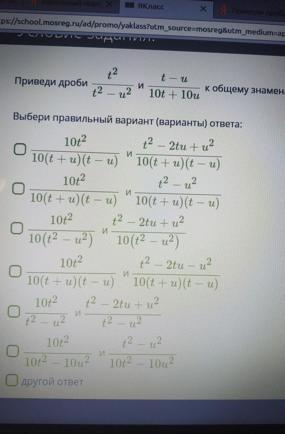 1)\frac{10t^{2}}{10(t+u)(t-u)}\\\\\frac{t^{2}-2tu+u^{2}}{10(t+u)(t-u)}\\\\\\3) \frac{t^{2}}{t^{2}-u^{2}}=\frac{10t^{2}}{10(t^{2}-u^{2})} \\\\\frac{t-u}{10t+10u}=\frac{t^{2}-2tu+u^{2}}{10(t^{2}-u^{2})}