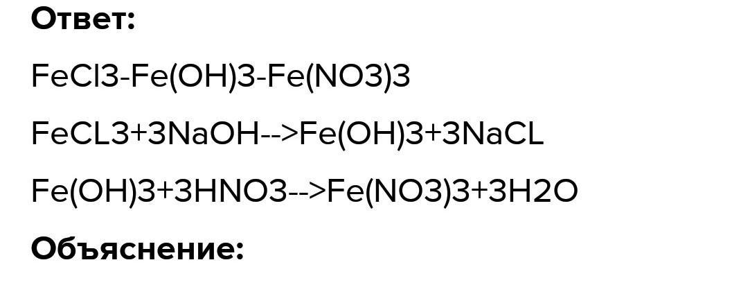 Проведите реакции при помощи которых можно осуществить следующие химические превращения FeCl3-Fe(OH)3-Fe(NO3)3:a)получение гидроксида железа(lll);б) получение нитрата железа(lll);реактивы растворы хлорида железа(ll),гидроксид натрия,азотная кислота