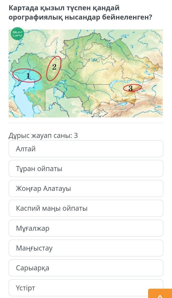 1 каспий маңы ойпаты 2 мұғалжар 3 жетісу алатауы ( жоңғар алатауы)