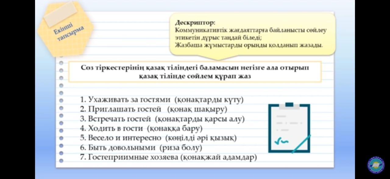 Бүгін анам қонақтарды жақсы күтіп алды. Себебі, бүгін менің туған күніме орай қонақ шақырдық. Қонақтарды қарсы алу кезінде, мен олардың батасын алу үшін, қолдарына су құйдым.Туған күн Кешіміз көңілді әрі қызық өтті. Келген қонақтар риза болып кетті. Себебі, біз оларға барынша қонақжай адамдар екенімізді көрсеттік.