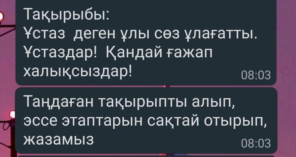 Менің ойымша, кез келген мұғалім ұстаз бола алмайды. Себебі, ұстаздық өнер - тағылымы терең өнер. Ал өнерлі болу кез келген адамға қона бермейді. Олай болса, шын ұстаз болу үшін табиғи дарын, ізгілікті ізденіс пен ерен еңбекке ұштастырылуы шарт. «Шәкіртсіз ұстаз тұл» деген тегін айтылмаса керек. Дүниедегі сыйлы адам да ұстаз. Себебі, шәкірт өнер, білім, әдеп тәрбие, кәсіп үйреткен адамының алдында өзін өмір бойы қарыздармын деп санап, ұстазының көзі тірісінде өзін, өлгеннен кейін аруағын сыйлап, ардақтап өтеді.