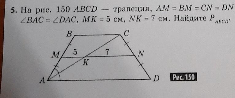 СРОЧНО!!!На рис. 150 ABCD — трапеция, AM = BM = CN = DN, ∠BAC = ∠DAC, МК = 5 см, NK = 7 см. Найдите Р