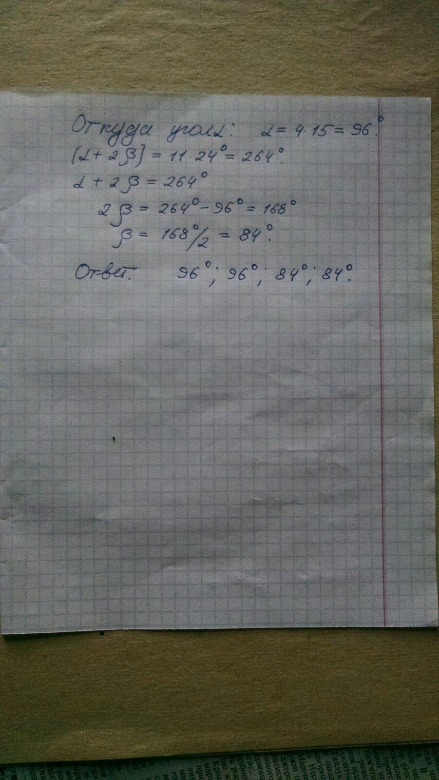 При пересечении двух прямых образовалось 4 угла один из которых относится к сумме трех другим как 4:11 найдите все 4 угла