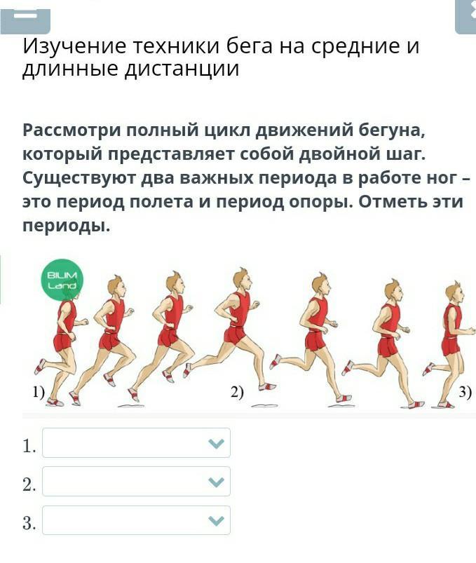 рассмотри полный цикл движение бегуна который представляет сабой двойной шаг существует два важных периода в работе ног это период полёта а и период апоры отметьте эти периоды .