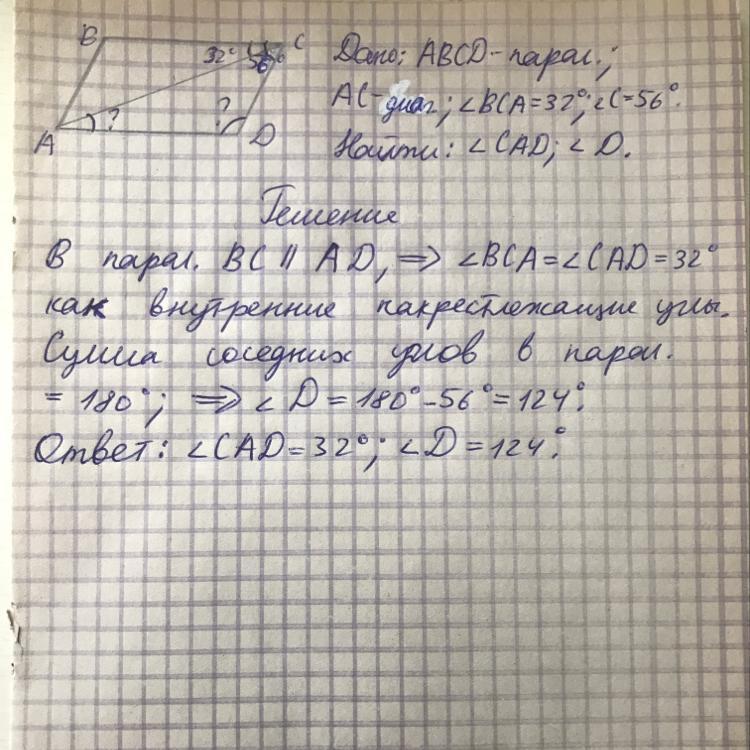 В паролелограме ABCD диоганаль AC образует со стороной AB угол,равный 32градуса,кутBCD=56 найти углы CAD и D