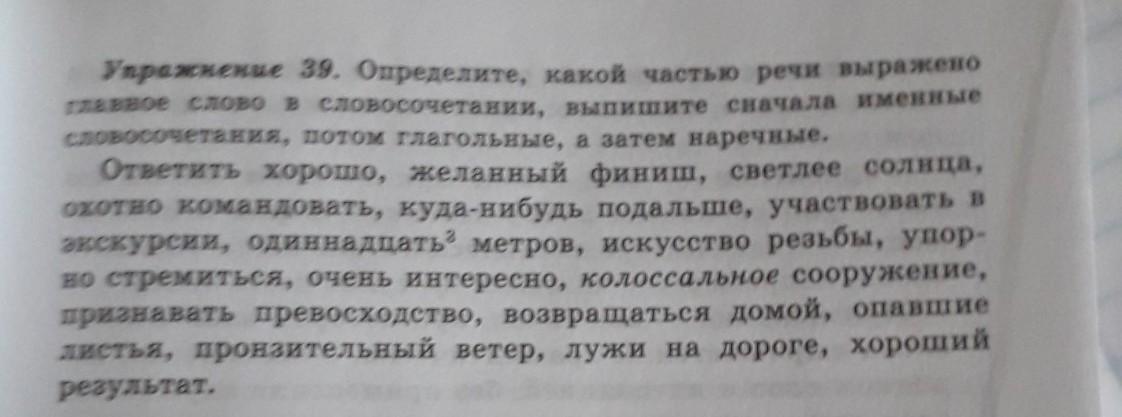 1. Именные словосочетания: светлее солнца, желанный финиш, одиннадцать метров, искусство резьбы, колоссальное сооружение, опавшие листья, пронзительный ветер, лужи на дороге, хороший результат.