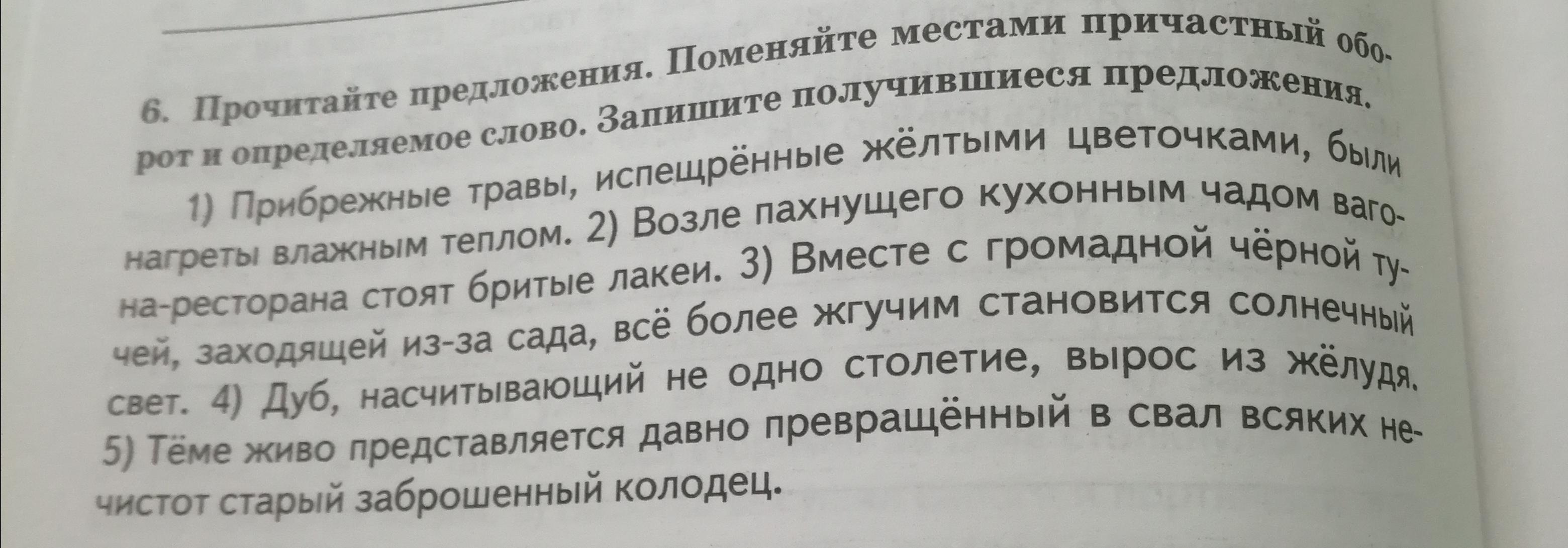 /Испещреные желтыми цветочками/ прибрежные травы× были нагреты влажным теплом. Возле вагона-ресторана×, /пахнущего кухонным чадом/, стоят бритые лакеи. Вместе с громадной черной /заходящей из-за сада/ тучей× все более жутким становился солнечный свет. /Насчитывающий не одно столетие/ дуб× вырос из желудя. Тёме живо представился старый заброшенный колодец×, /давно превращенный в свал всяких нечистот/.