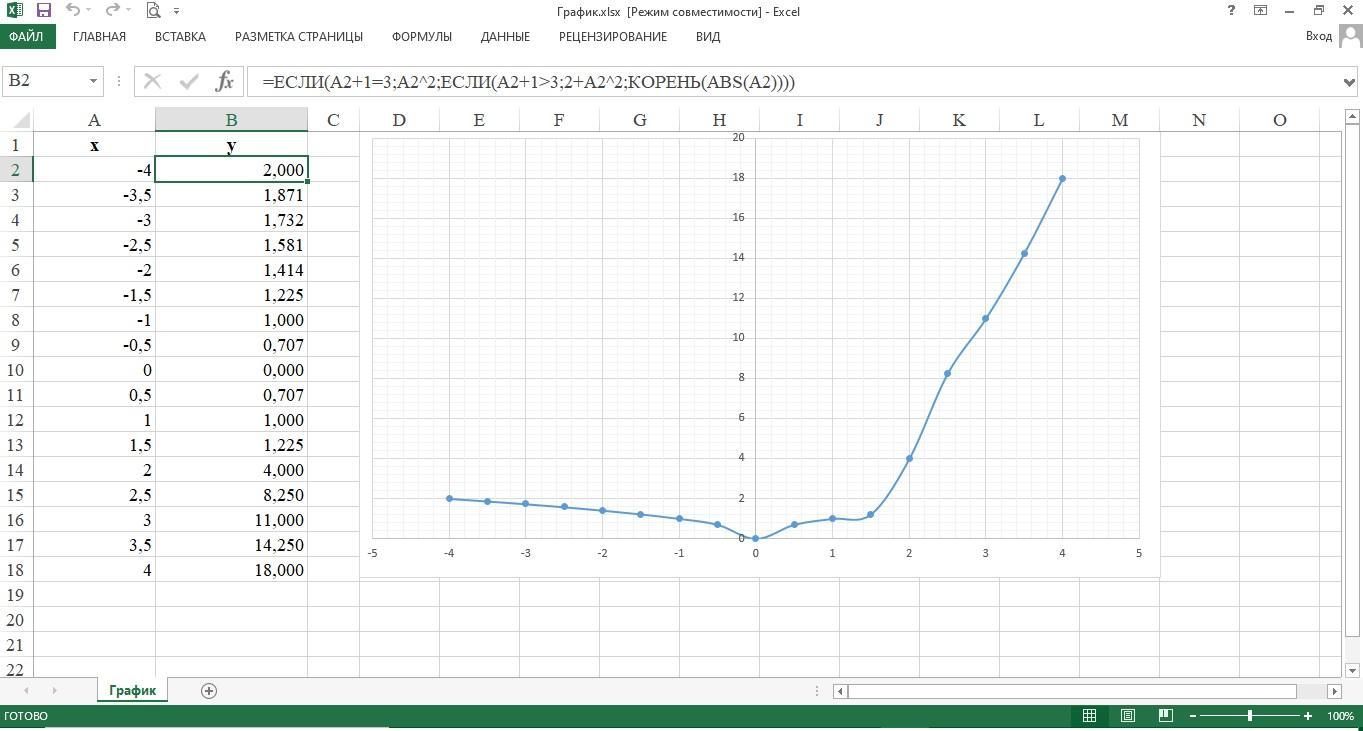 =ЕСЛИ(A2+1=3;A2^2;ЕСЛИ(A2+1>3;2+A2^2;КОРЕНЬ(ABS(A2))))