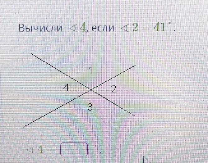 На рисунке мы видим вертикальные углы, а как мы уже знаем вертикальные углы равны, значит угол 2 равен углу 4, то есть угол 4= 41°