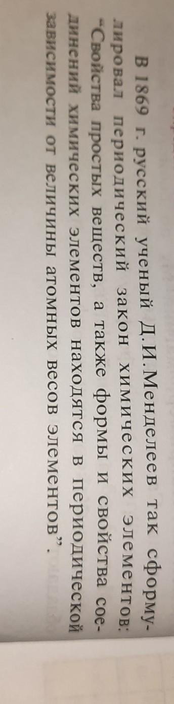 Современная формулировка периодического Закона Д. И. Менделеева такова: свойства химических элементов, а также формы и свойства соединений элементов находятся в периодической зависимости от величины заряда атомных ядер. Закон назван периодическим, поскольку выведен из периодического изменения свойств элементов.