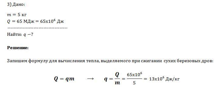 3) чему равна удельная теплота сгорания сухих берёзовых дров если при полном сгорании этого топлива массой 5 кг выделилось количество теплоты 65 МДж?