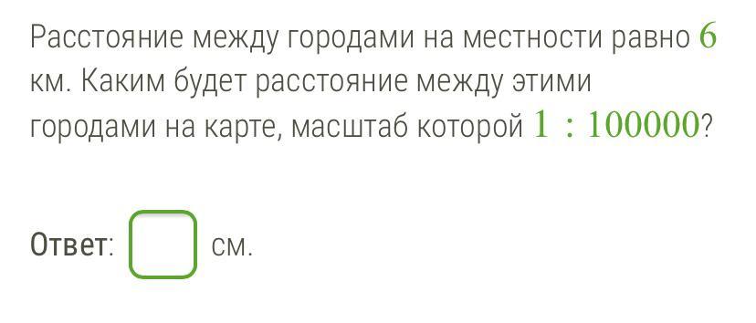 Расстояние между городами на местности равно 6 км. Каким будет расстояние между этими городами на карте, масштаб которой 1: 100000?