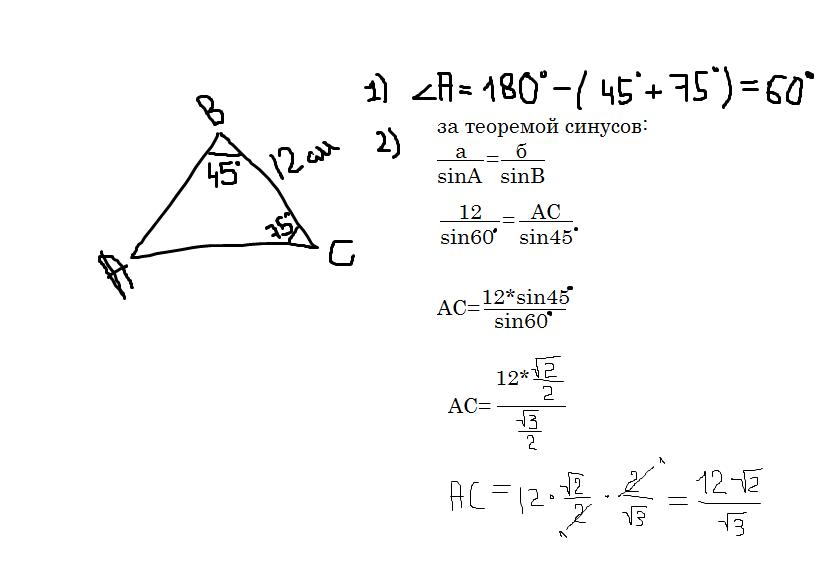 Сторона BC треугольника ABC равна 12 см, угол B=45°, угол C=75°.Найдите длину стороны AC