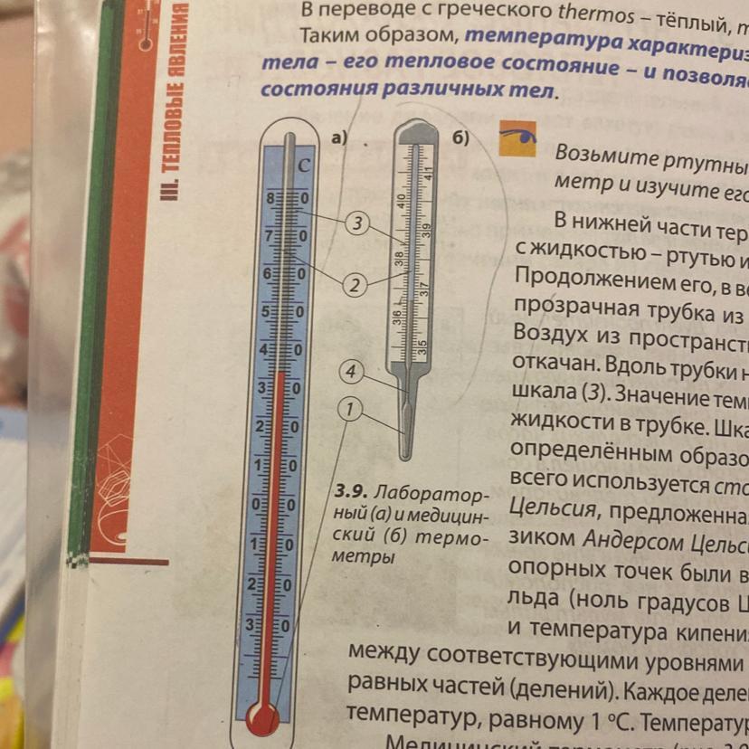 Внимательно посмотрите на лабораторный термометр, изображённый на рисунке 3.9 (стр. 50). Чему равна цена деления? Какую температуру показывает термометр? Чему равна его приборная погрешность?