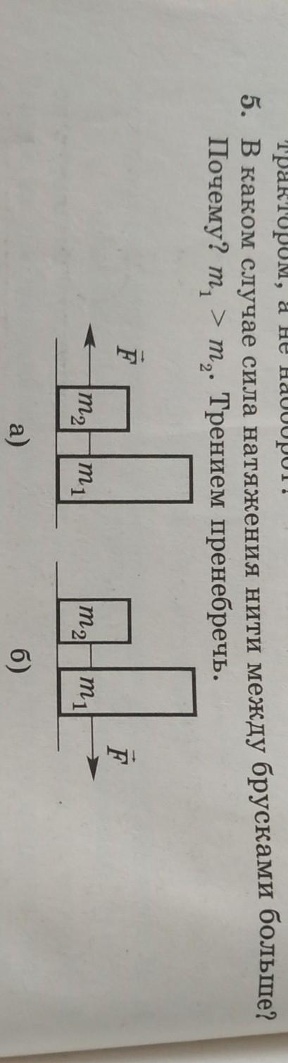 В случае а). Так как там лёгкий брусок тянется без проблем, но вот чтобы двигать брусок тяжелее необходима большая сила, а в месте с ней и большее натяжение.