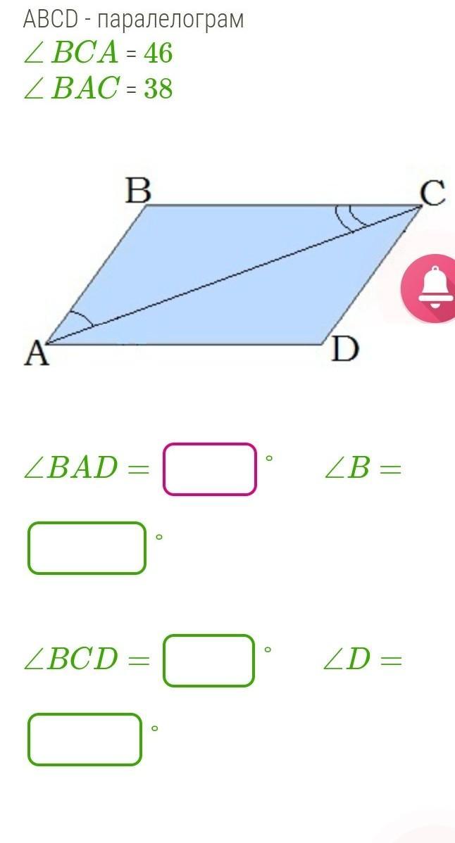 (или же можно было найти угол ВСD так: УГОЛ ВСD= углу ВАD=84(ТАК КАК ПРОТИВОПОЛОЖНЫЕ УГЛЫ ПАРАЛЕЛОГРАМ РАВНЫ))