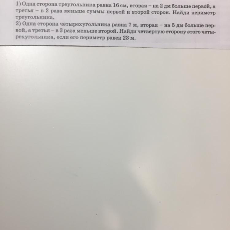 Вторая сторона ?, на 2 дм больше значит больше на 20 см. А чтобы найти третью сторону нужна сумма двух первых 16+20=36 это сумма 2-х сторон по условию говориться что третья меньше в два раза значит она равна 36:2=18. И тогда периметр будет равен 16+20+18=54 см.