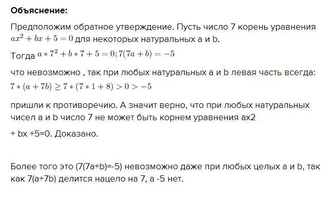 пришли к противоречию. А значит верно, что при любых натуральных чисел a и b число 7 не может быть корнем уравнения ax2