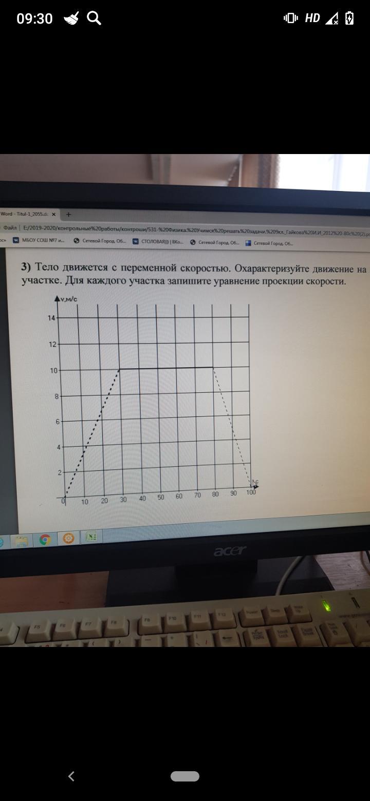 Первый участок - скорость изменяется со временем, растёт, значит движение равноускоренное, уравнение: