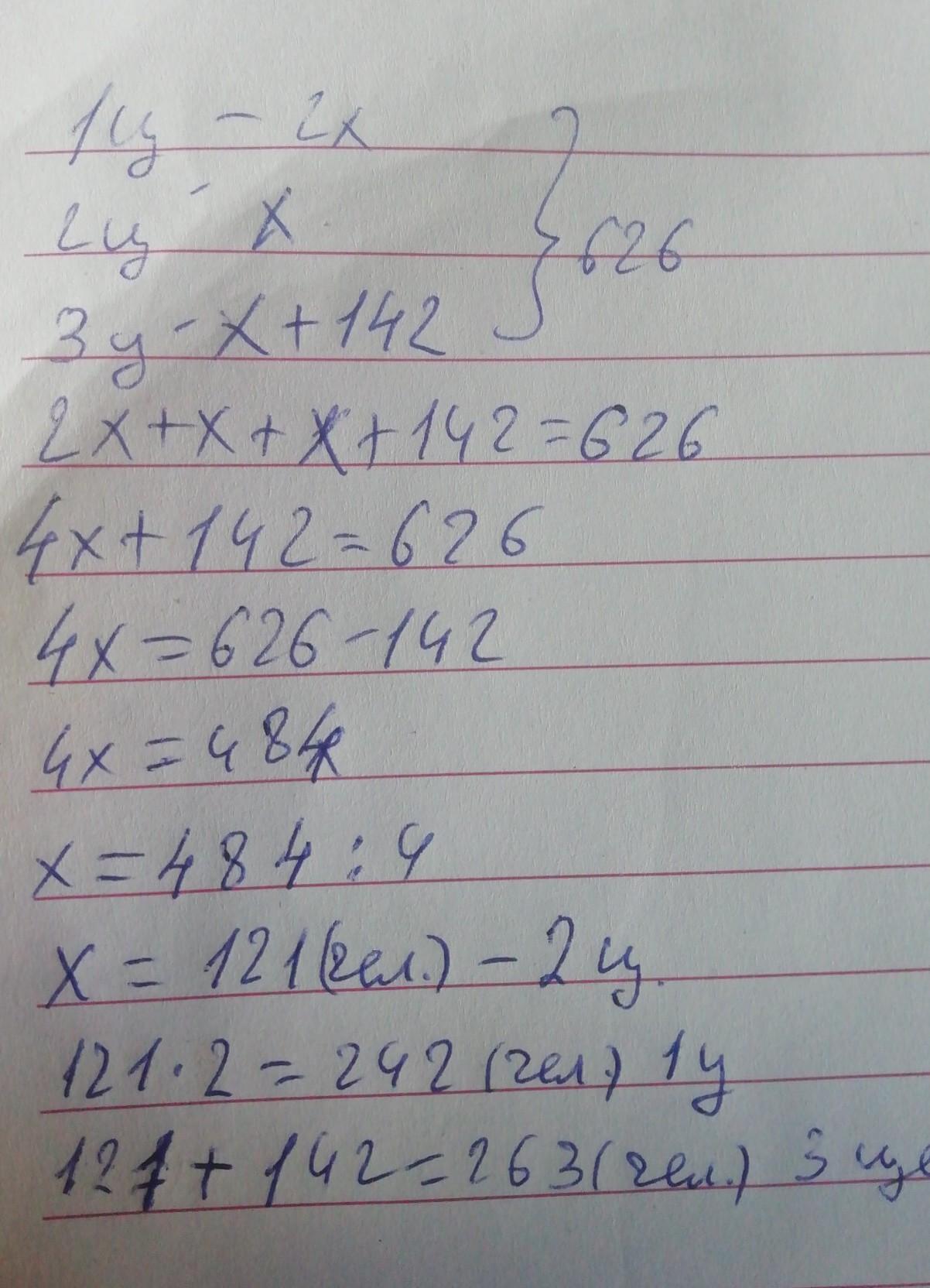 На заводе в трех цехал работает 626 человек в первом цехе работает в 2 раза большечеловек чем во втором а в третьем на 142 человека больше чем во втором сколько человек работает в каждом цехе