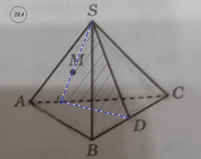 28.4. Так как точки S и М лежат в одной плоскости ASС , то можем соединить эти точки прямой линией до пересечения её с ребром АС . Точку пересечения обозначим К.