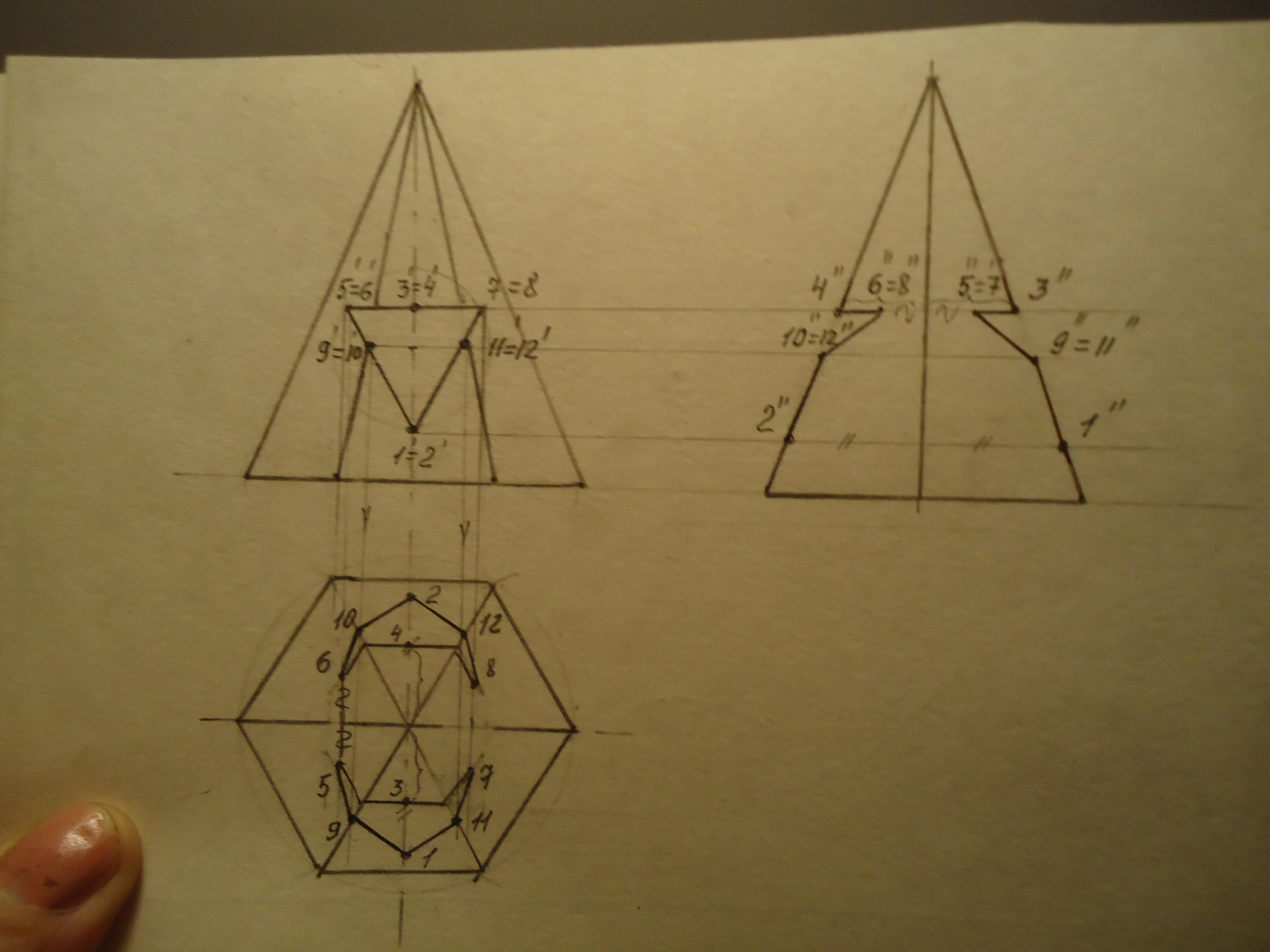 Остаётся перенести точки 9,10,11,12 на рёбра видов слева и сверху и достроить сечения.