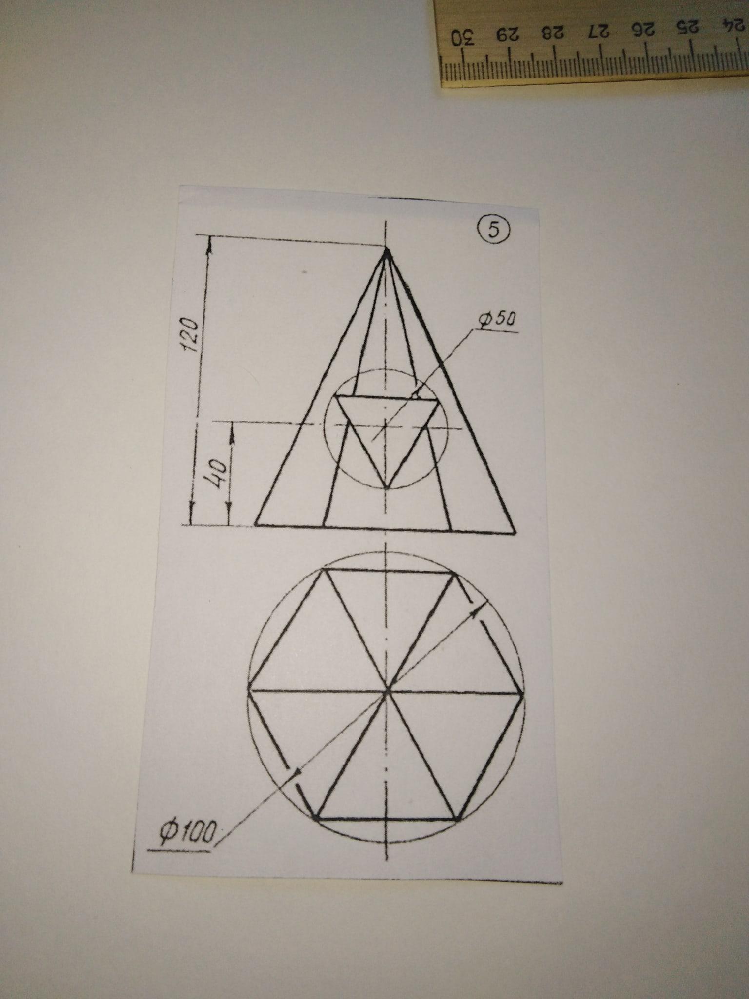 Надеюсь,что деление круга на 3 и 6 частей вы знаете и сами пирамиду и треугольное отверстие построить сможете.