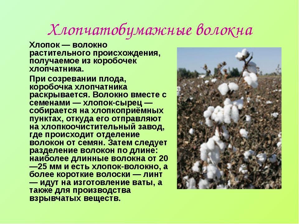Ткань из хлопка рождается постепенно. После того как крупные кремовые или желтоватые цветки превратятся в коробочку с яйцевидными семенами, на них появляется до 15 тысяч тоненьких волосков. Прочность каждого волоска зависит от созревания семян, на которых со временем откладывается целлюлоза. Толщина волосков увеличивается, они становятся похожими на скрученную по спирали ленточку. Самым качественным волокном считается то, в состав которого входит до 96% целлюлозы. Так получают качественный хлопок-сырец, который очищается от различных примесей, в первую очередь от семян. Позже его отправляют на переработку.