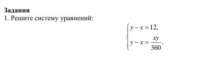 {y-x=12 {x=y-12 {x=y-12 {y-x=xy/360 {y-y-12=y-12*y/360 {-12=y-2*y/360 x=y-y-2*y/360=y-(-12) x=-2*y/360=y+12 x=y+12=2*y/360 y=x-12 {x-12-y+12=12 {x-y=12 {x-12-y+12=((y+12)(x-12))/360 {x-y=xy/360