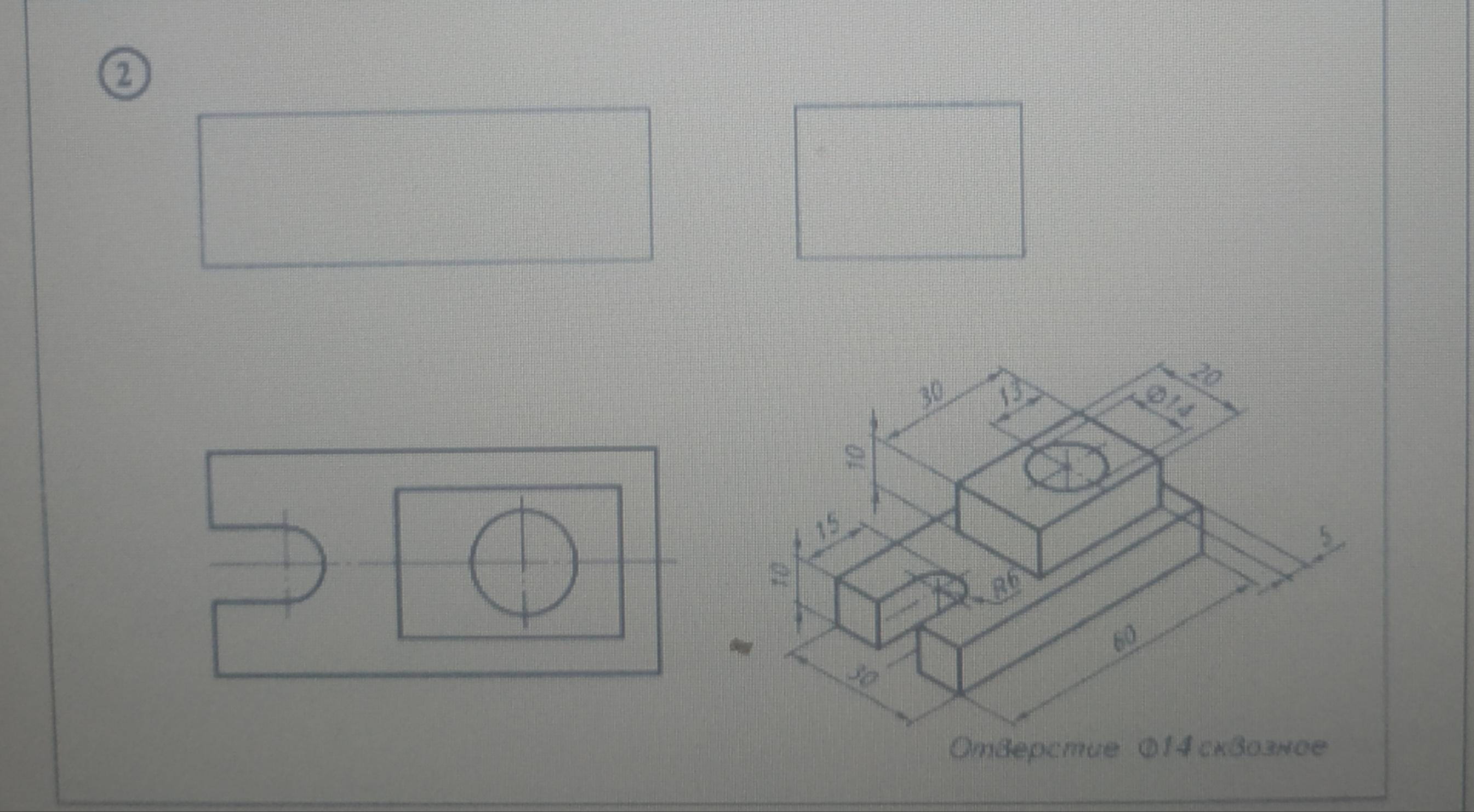По наглядному примеру изображения и данному виду определить целесообразный разрез и выполнить его в соответствующем габаритным прямоугольнике,второй прямоугольник убрать.На чертеже детали поставить размеры.Упражнение 12(2,3)
