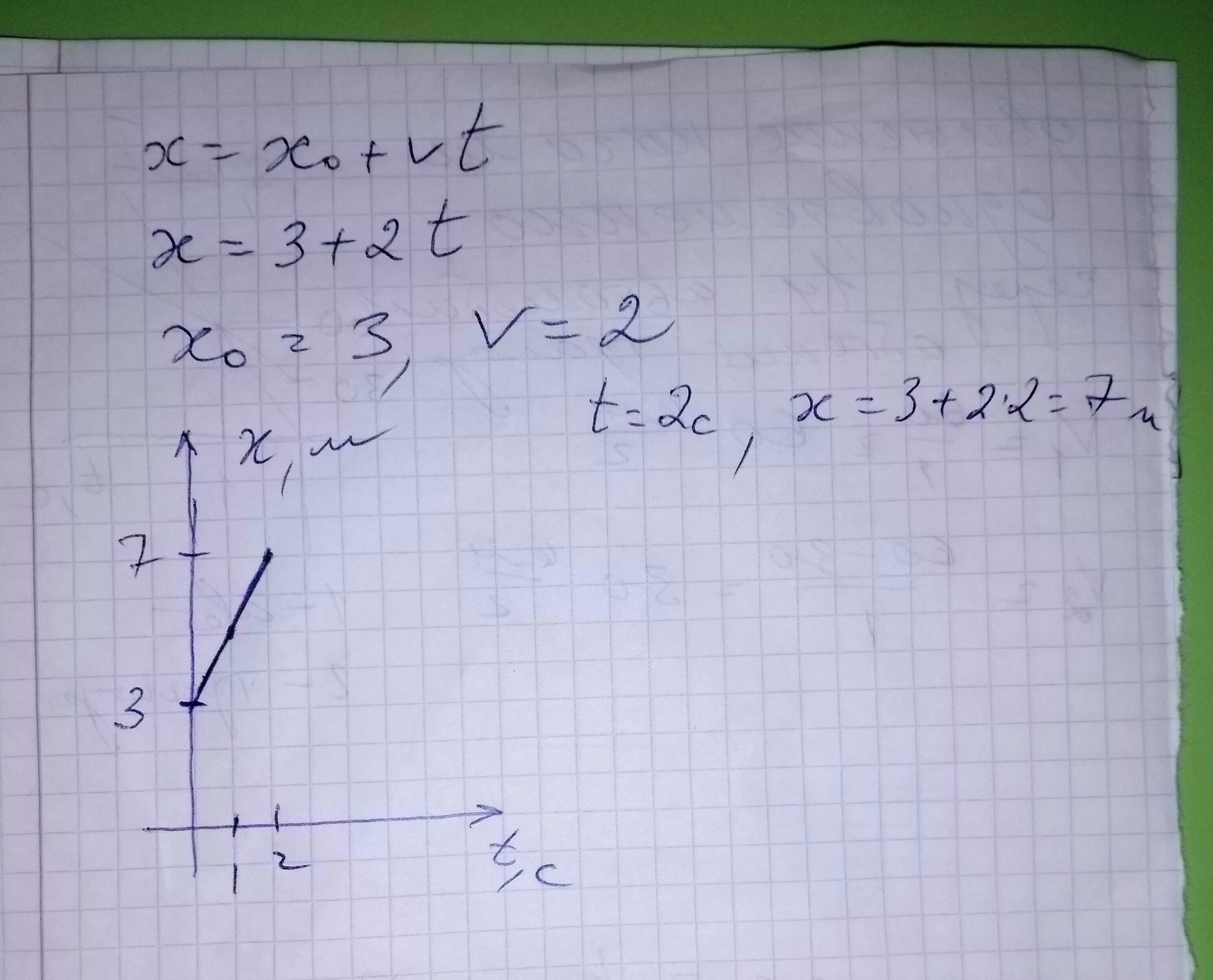 Дано закон движения тела (зависимость координаты тела от времени): х=3 + 2t (м). Найдите начальную координату тела, значение скорости тела. Постройте график зависимости координаты от времени.