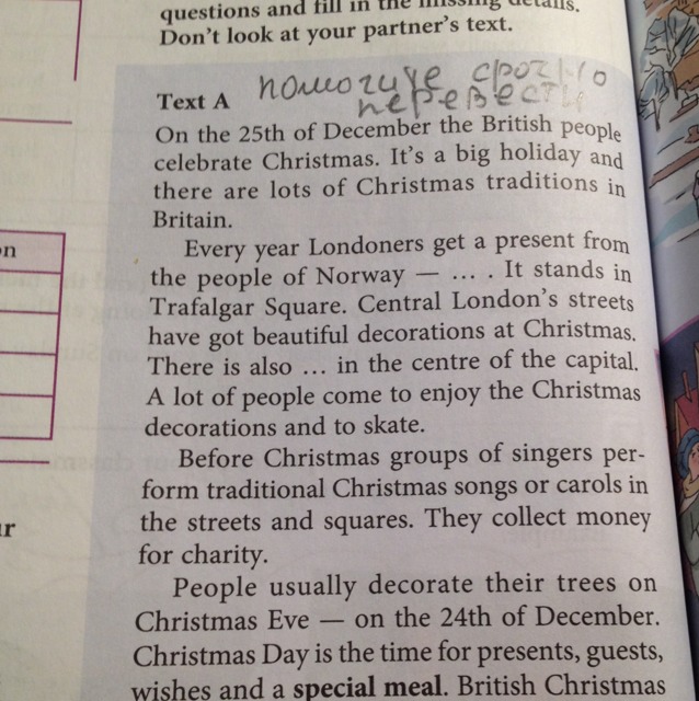 25 декабря в Британии празднуют Рождество. Это огромный праздник с множеством традиций. Каждый год жители Лондона получают подарок от жителей Норвегии - (...). Это устанавливается на Трафальгарской площади. Центральные улицы Лондона очень красиво украшаются. Также здесь (...) в центре столицы. Множество людей приходят полюбоваться украшениями к Рождеству и покататься на коньках.