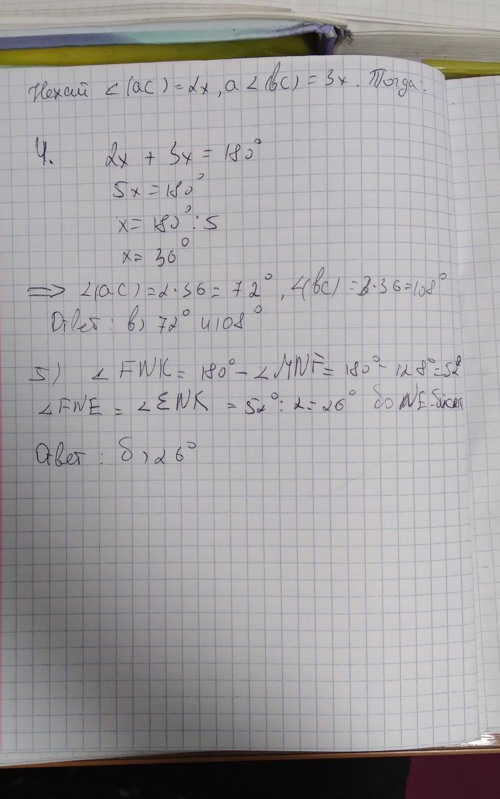 Т.к. ∠(ac) / ∠(bc) = 2/3 => обозначим за x - коэффициент пропорциональности. => 2*x + 3*x = 180° ; 5*x = 180° ; x = 180° / 5 = 36° ;