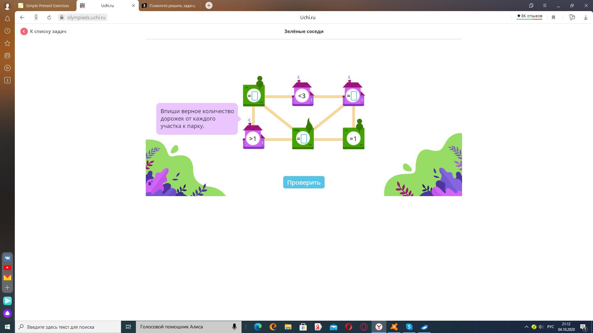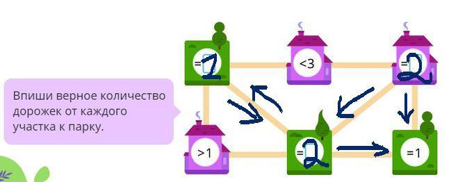 От третьего парка (в правом верхнем углу) также прокладываются две дорожки, одна из которых идет к шестому (прям под ним), а вторая - по диагонали к пятому. В третий парк записываем двоечку.
