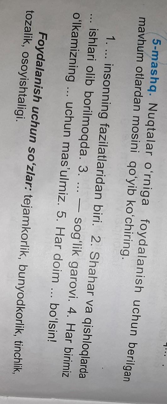 Ответ: 1.Tejamkorlik insonning vazilatlaridan biri.2. Shahar va qishloqlarda bunyodkorlik ishlari olib borilmoqda.3. Tozalik – soglik garovi.4. Har birimiz o'lkakizning osoyishtaligi uchun mas'ulmiz.5. Har doim tinchlik bo'lsin!