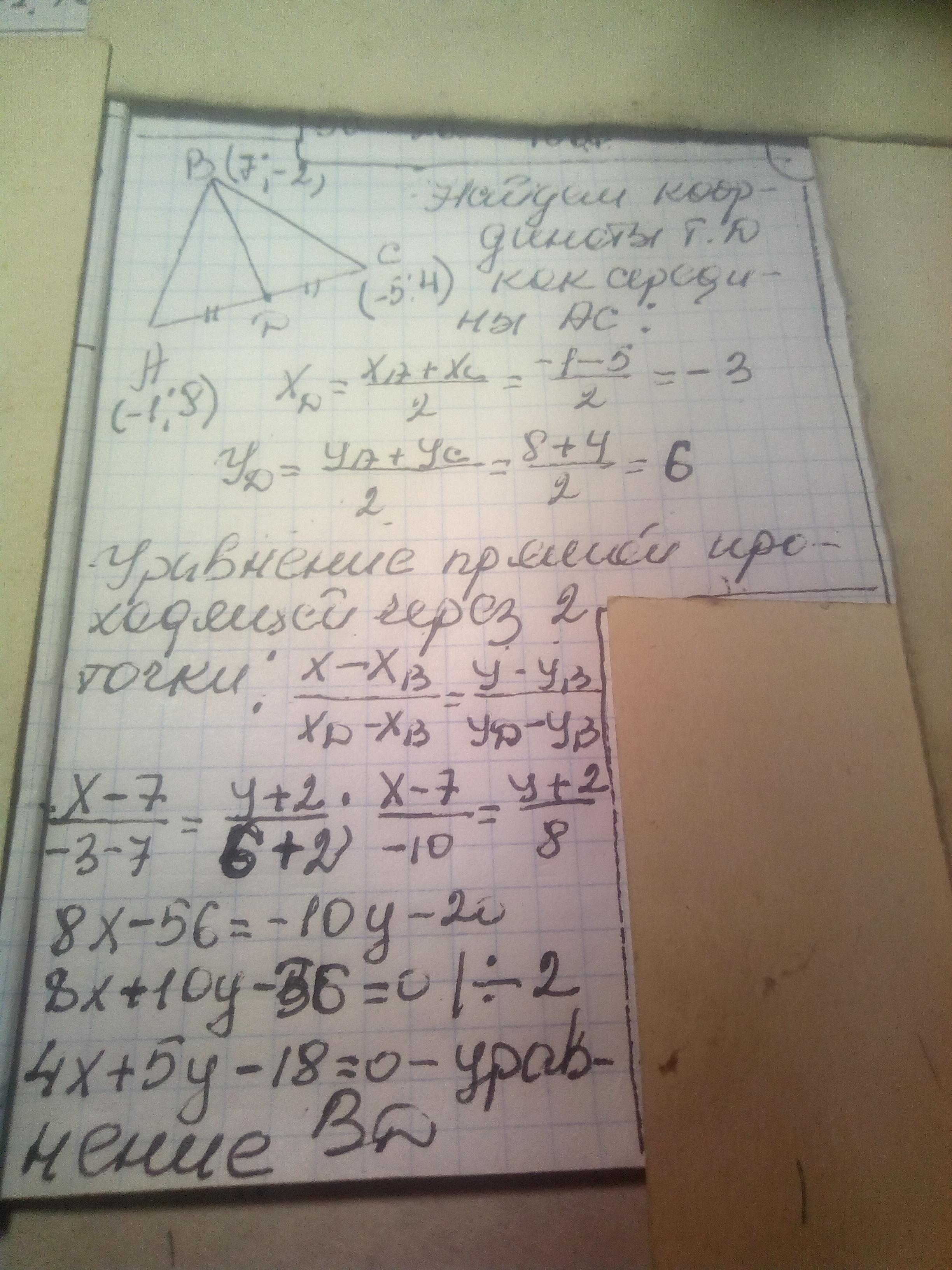 Для знаходження медіани BD є координата однієї точки В(7; -2), а координати другої точки прямий D знайдемо як координати середини відрізка AC, де A(-1; 8), С(-5; 4) за формулою D((xA+xC) / 2; (yA+yC) / 2) => D((-1+(-5)) / 2;(8+4) / 2) => D(-3; 6)