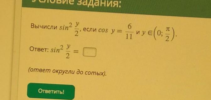 (sin(y/2))^2=(1-cos(y))/2=(1-6/11)/2=5/22=0,23