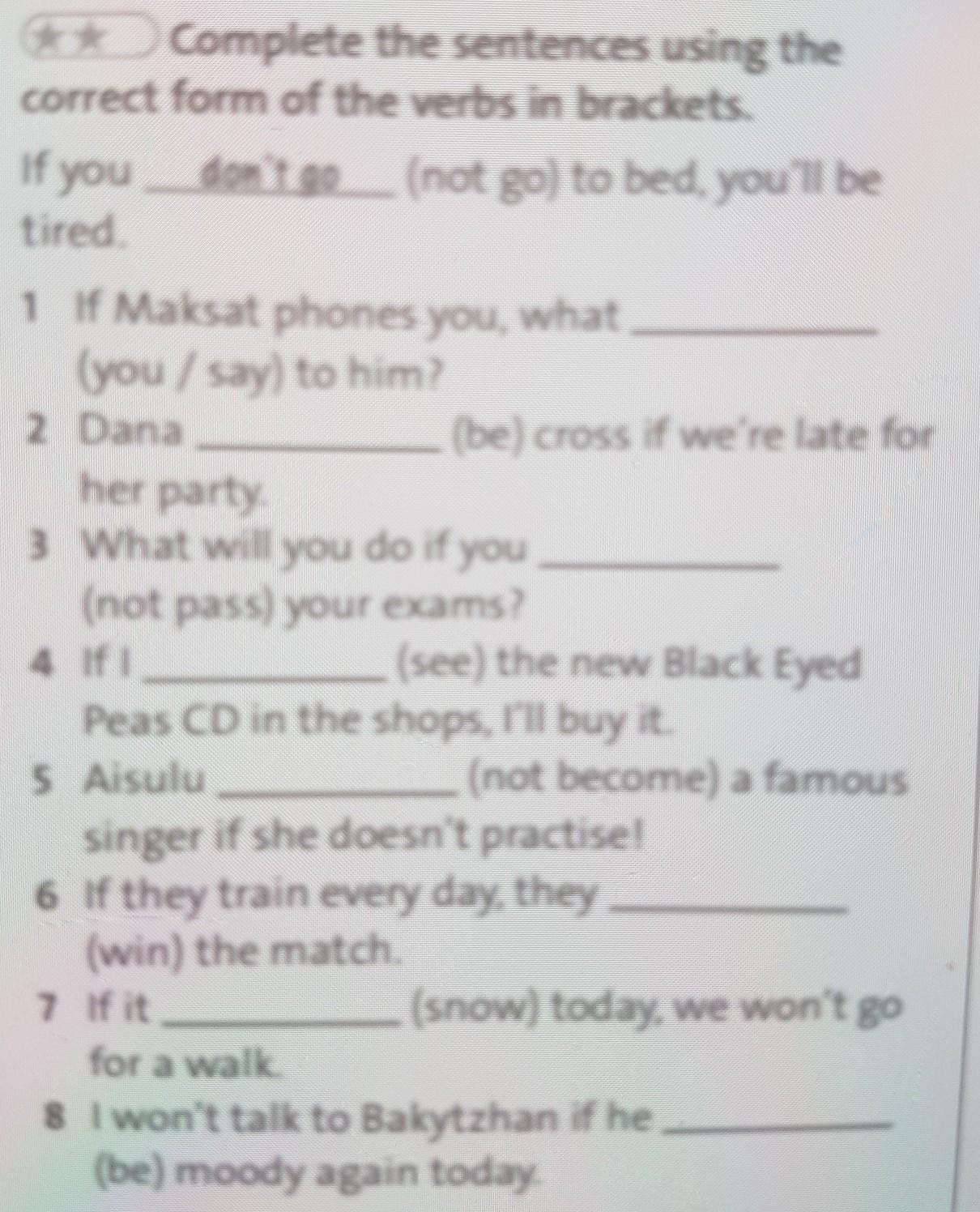 Ответ:1 if Maksat phones you, what will you say to him? 2 Dana will be cross if we are late for her party. 3 What will you do if you won't pass your exam? 4 If I see the new Black Eyed Peas CD in the shops, I'll buy you. 5 Aisulu won't become a famous singer if she doesn't practise! 6 if they train every day, they will win the match. 7 if it snows today, we won't go for a walk. 8 I won't talk to Bakytzhan if he is moody again today.