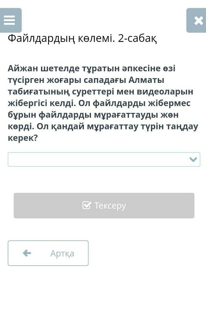 Айжан шетелде тұратын әпкесіне өзі түсірген жоғары сападағы Алматы табиғатының суреттері мен видеоларын жібергісі келді. Ол файлдарды жібермес бұрын файлдарды мұрағаттауды жөн көрді. Ол қандай мұрағаттау түрін таңдау керек?