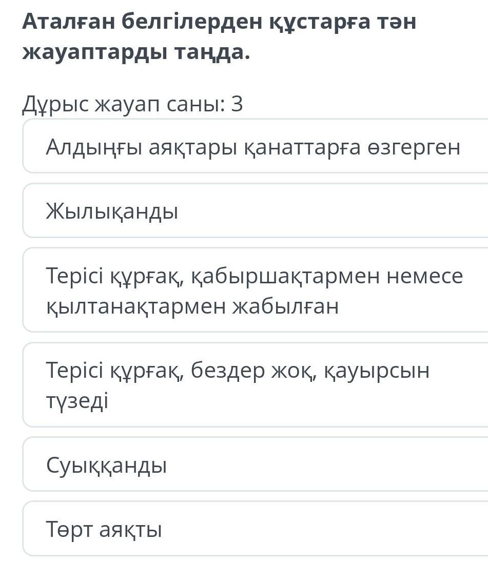 Ответ:жылықанды,алдыңғы аяқтары қанаттарға өзгерген,терісі құрғақ,бездер жоқ,қауырсын түзеді