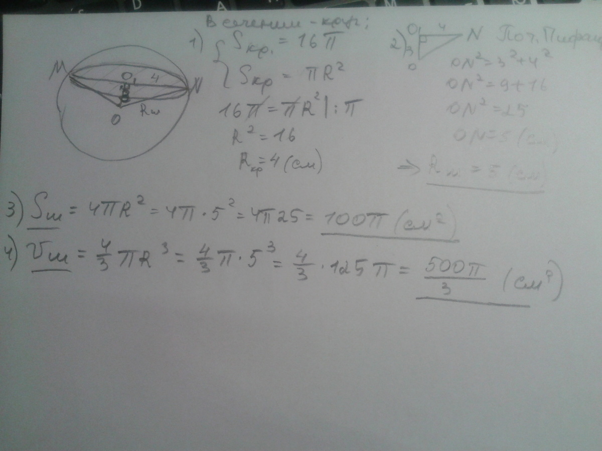 Сечение шара площадью 16 п кв. см находится на расстоянии 3 см от центра шара. Найдите радиус, площадь сферы, объём шара