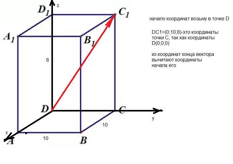 Высота правильной четырехугольной призмы равна 8, а сторона ее основания 10.Укажите координаты вектора DC1?