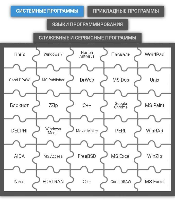 На рисунке отмечены прикладные программы, языки программирования, служебные и сервисные программы.