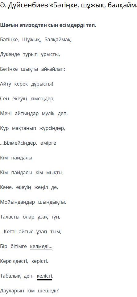Ә. Дүйсенбиев «Бәтіңке, шұжық, балқаймақ» өлеңі Шағын эпизодтан сын есімдерді тап.Помогите пожалуйста.Срочно дам 15 балов.