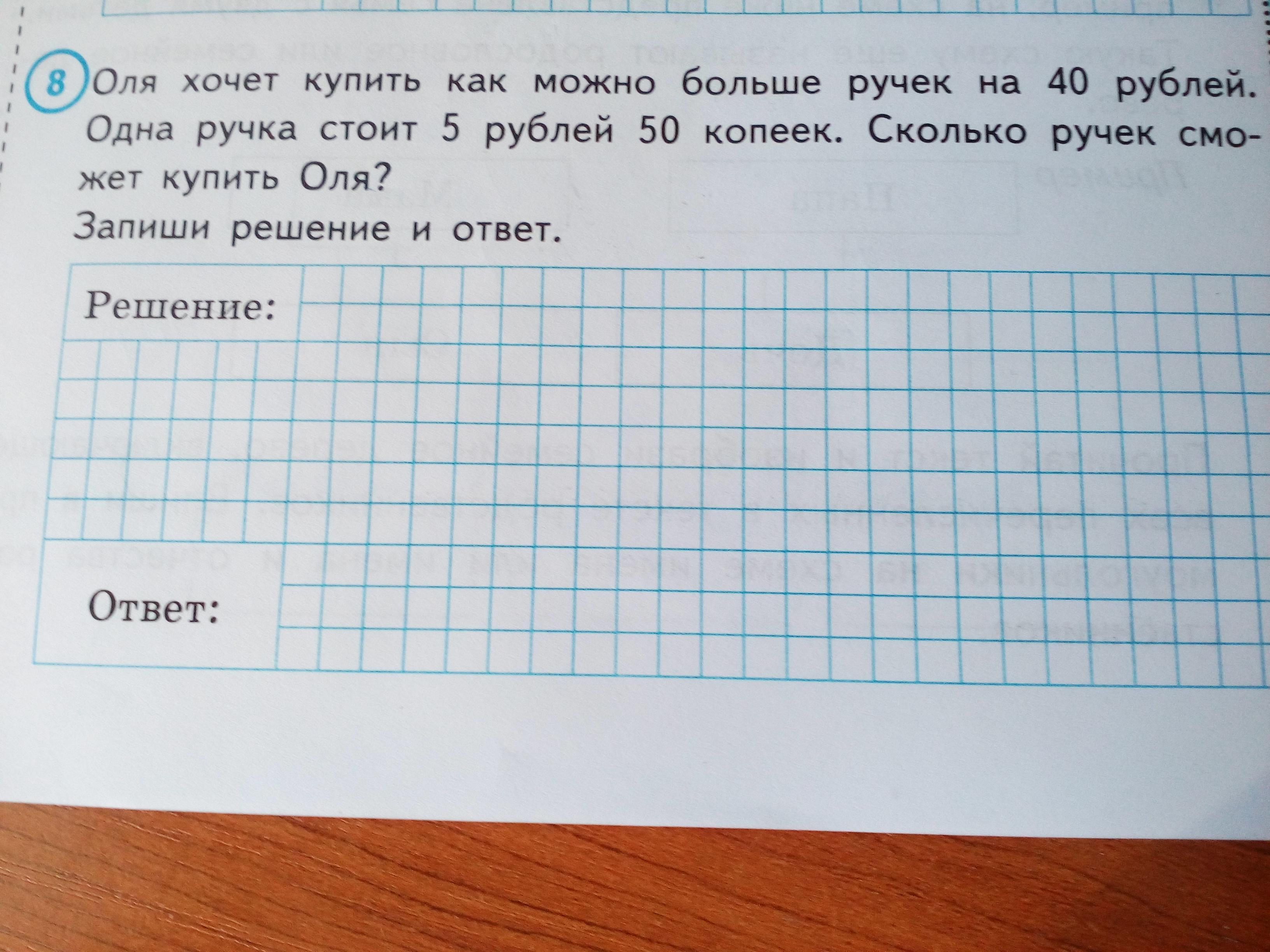 40÷5.50= 7,272727= 7 (ручек)- 7 ручек сможет купить Оля.