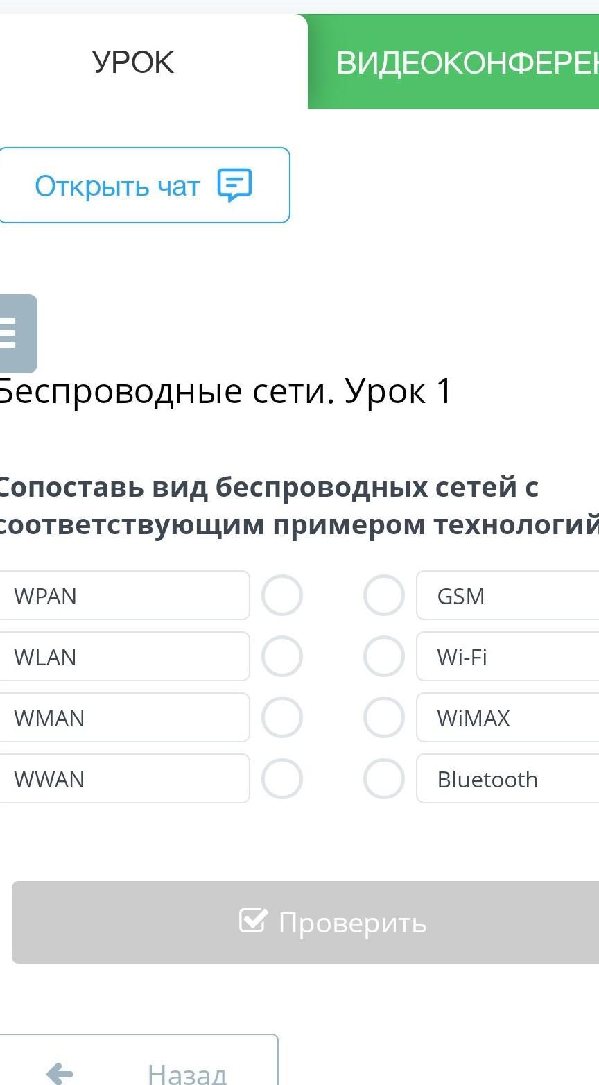 Сопоставь вид беспроводных сетей с соответствующим примером технологий.