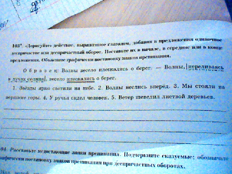 Дорисуйте действие ,выраженное глаголом ,добавив в предложение одиночные деепричастие или деепричастный оборот. Поставьте их в начале,в середине или в конце предложения. Объясните графически постановку знаков припинания.